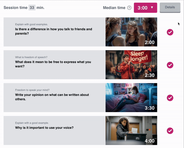 Before hitting Start, customize the median writing time. The session time will also update, providing an accurate metric that you can plan your classes by. You can adjust median writing times per class from the Manage Classes page in the top-right menu of the portal.